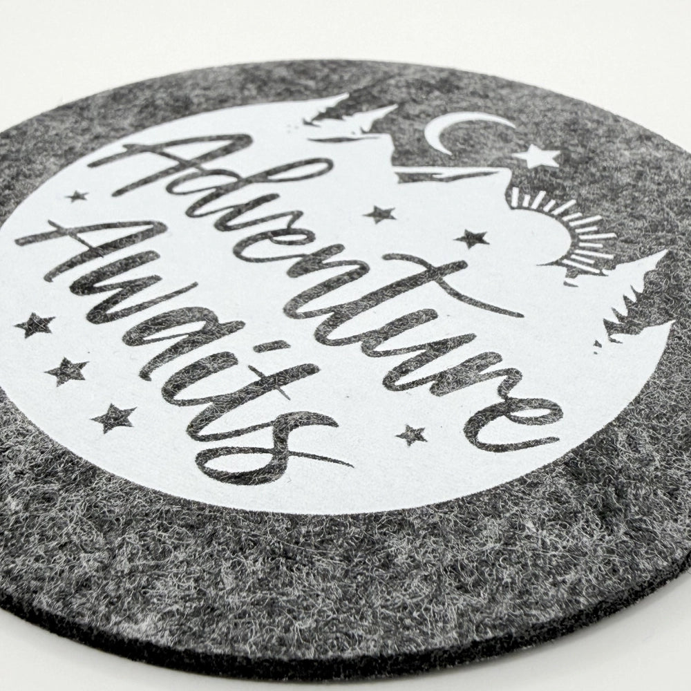 Dieser Filzuntersetzer mit "Adventure Awaits" Motiv bringt echtes Camper-Feeling auf deinen Tisch.