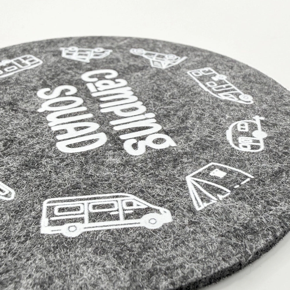 Dieser Filzuntersetzer mit "Camping Squad" Motiv bringt echtes Camper-Feeling auf deinen Tisch.