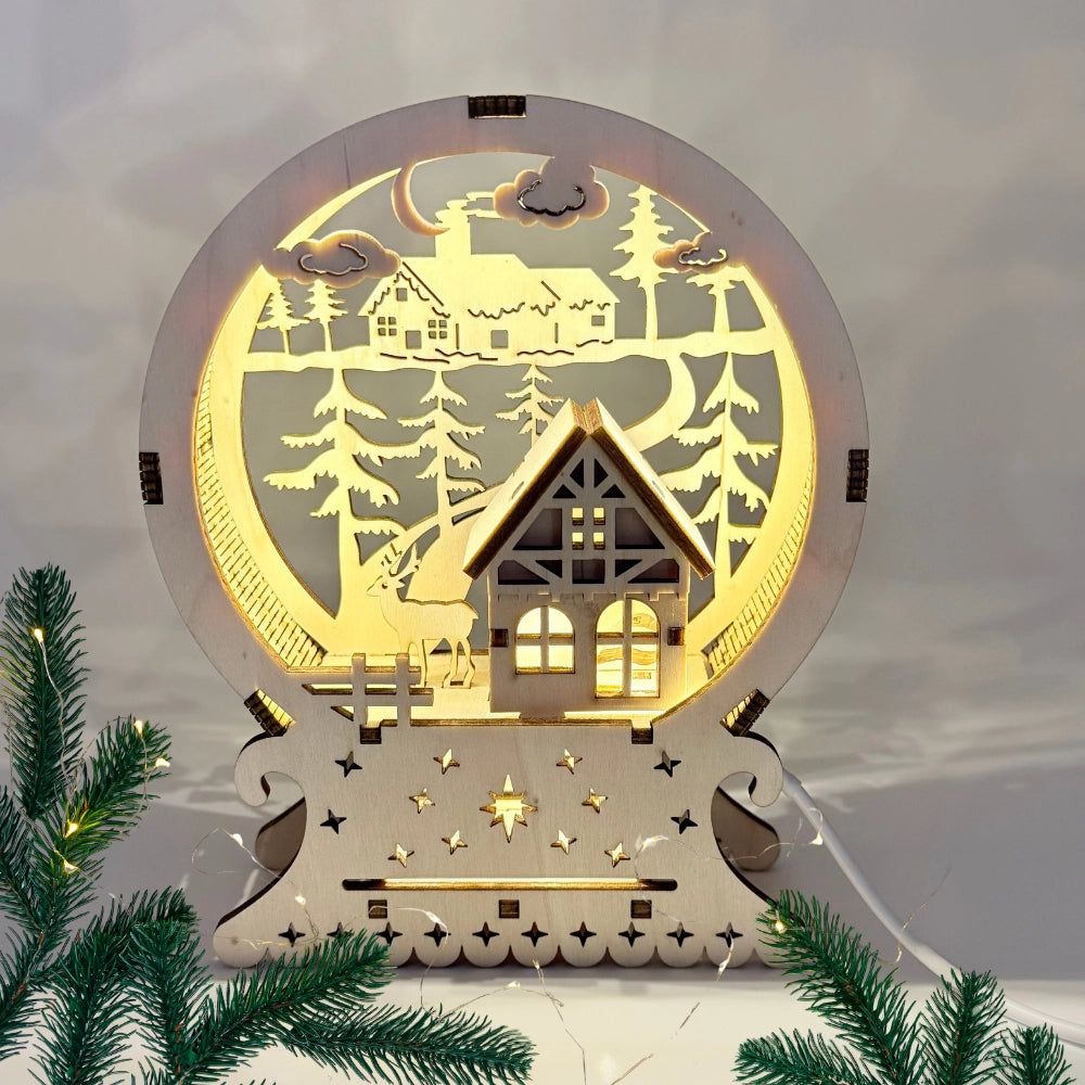 Unser LED-Dekolicht „Winterzauber“ vereint filigrane Lasercut-Kunst mit liebevoller Handarbeit. Jede einzelne Szene (das kleine Haus, der verschneite Wald, das Reh im Vordergrund) wird von uns präzise gelasert, sorgfältig von Hand zusammengebaut und verleimt, sodass ein ganz besonderes Stück Weihnachtsstimmung entsteht. Das warme LED-Licht durchleuchtet die feinen Silhouetten und lässt die winterliche Landschaft lebendig wirken.