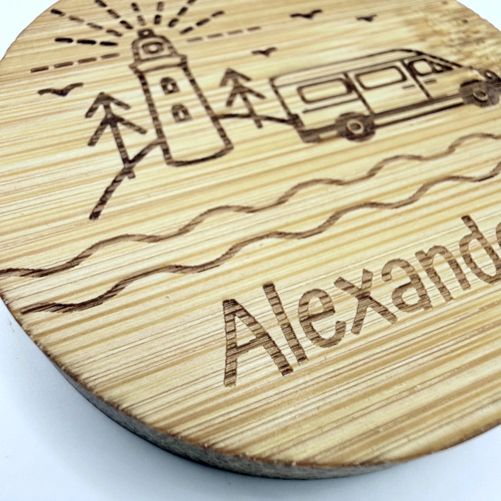 Dieser personalisierte Bambus-Magnet mit abenteuerlich-maritimen Leuchtturm und deinem lieblings-Fahrzeug drauf ist schick und praktisch. Er hält deine Notizen fest und öffnet zugleich im Handumdrehen deine Flaschen. Ein praktischer und gleichzeitig dekorativer Helfer.