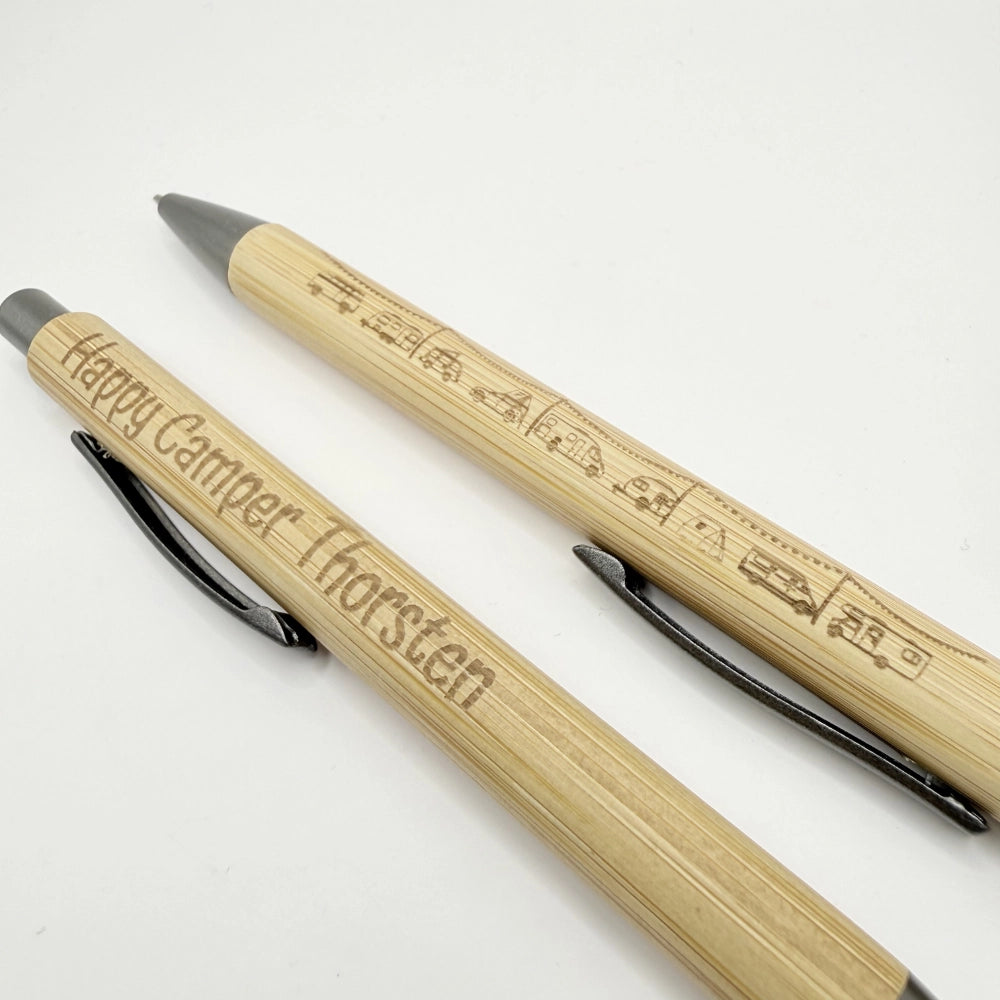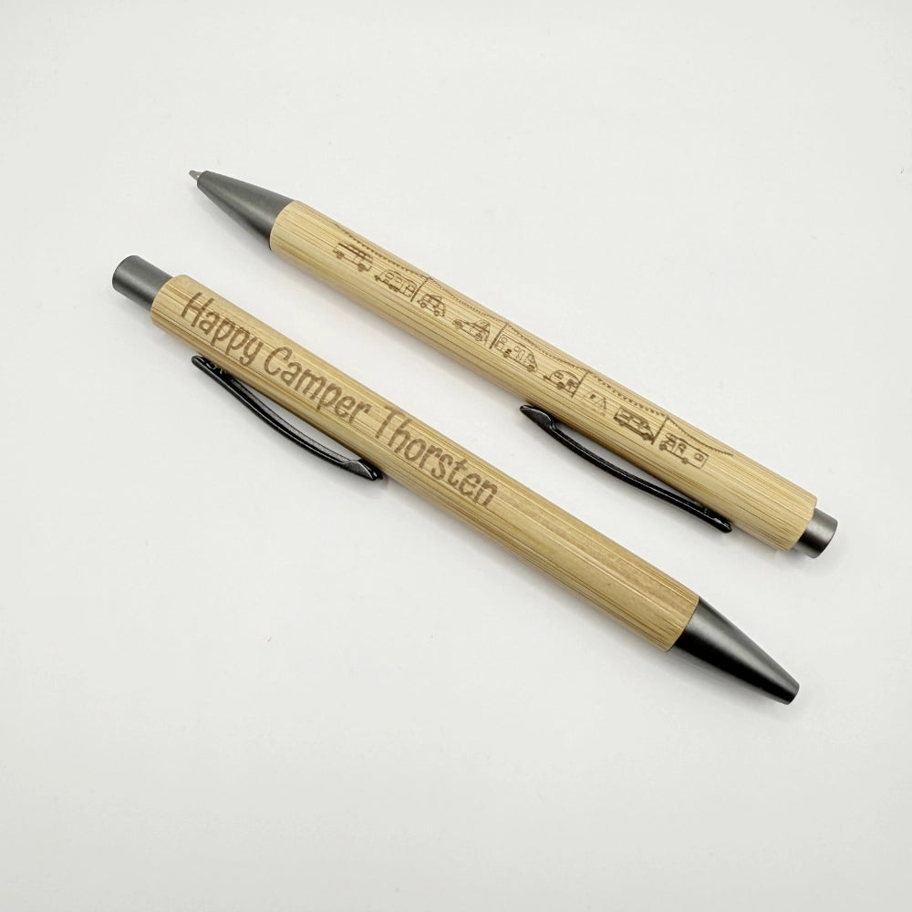 Dieser natürliche Bambus-Kugelschreiber "Happy Camper" vereint Funktionalität mit natürlichem Design, für alle Camping-Liebhaber.