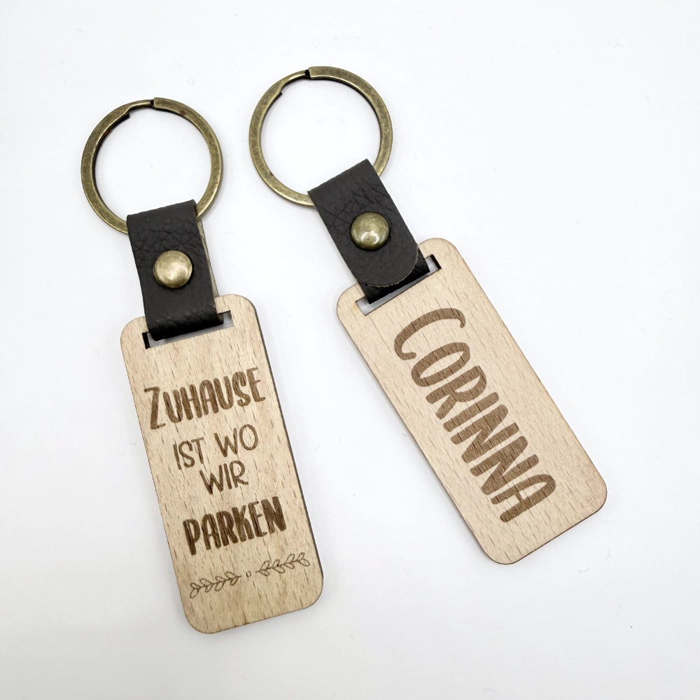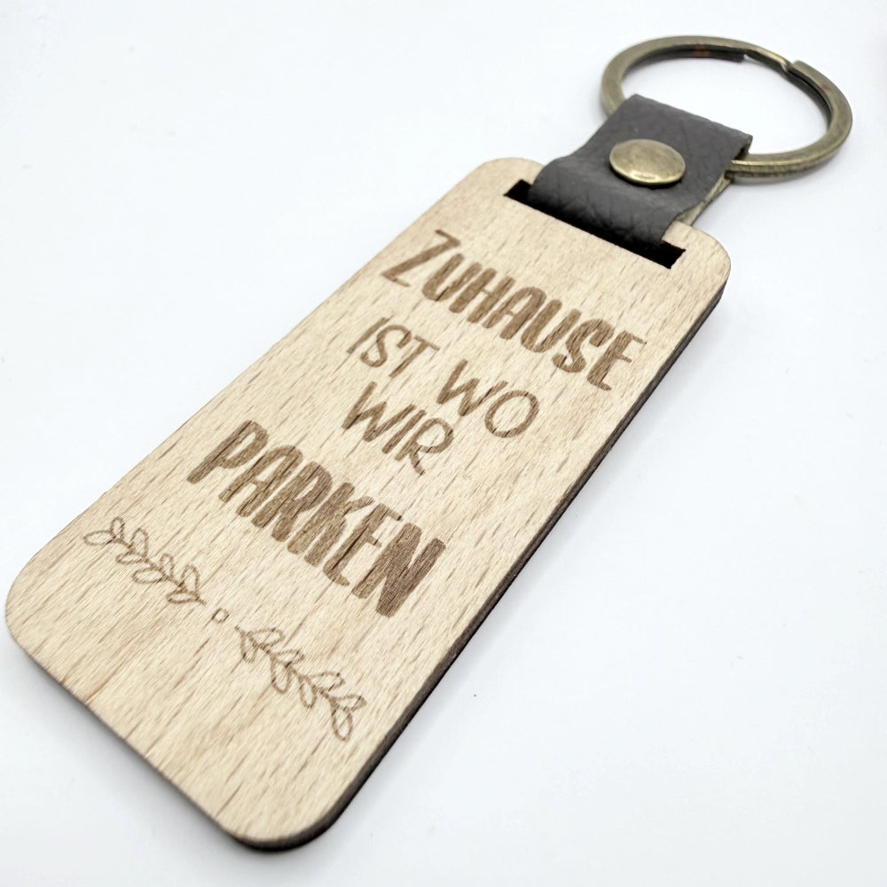 Dieser natürliche Schlüsselanhänger aus Holz mit "Zuhause ist wo wir campen"-Spruch ist dein täglicher Reminder ans Camper-Glück.