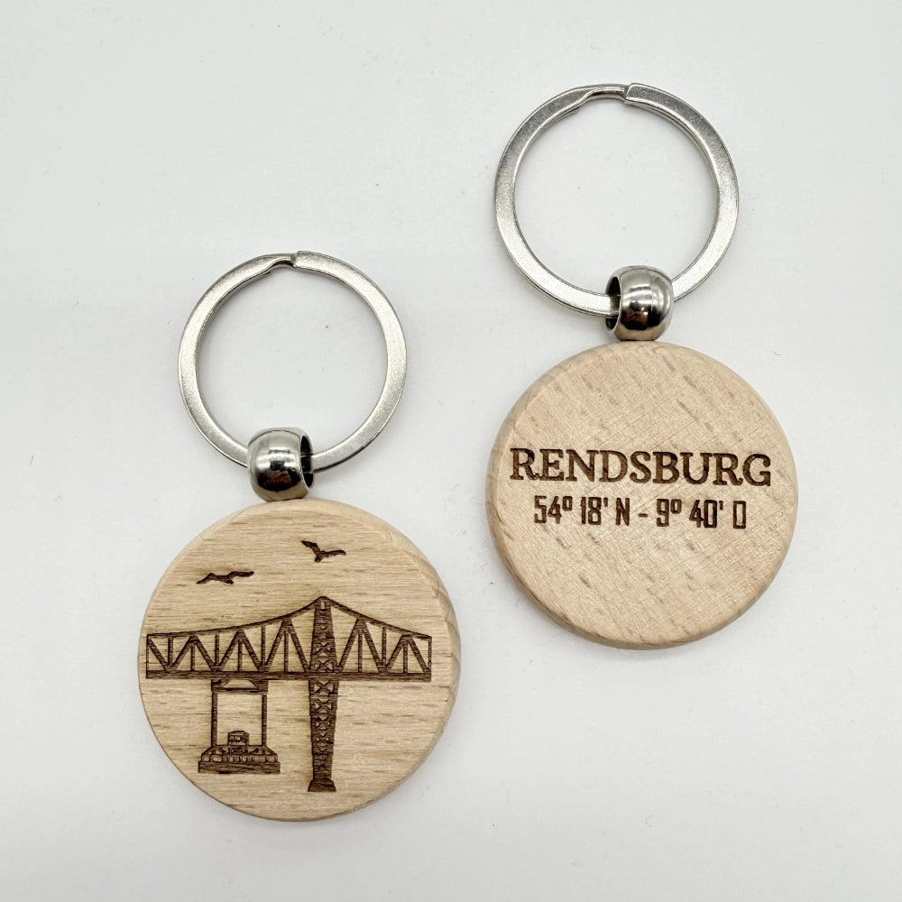 Dieser runde natürliche Schlüsselanhänger aus Holz mit Motiv der Rendsburger Schwebefähre ist das perfekte Stück Heimat für alle Rendsburger und Fans der Stadt