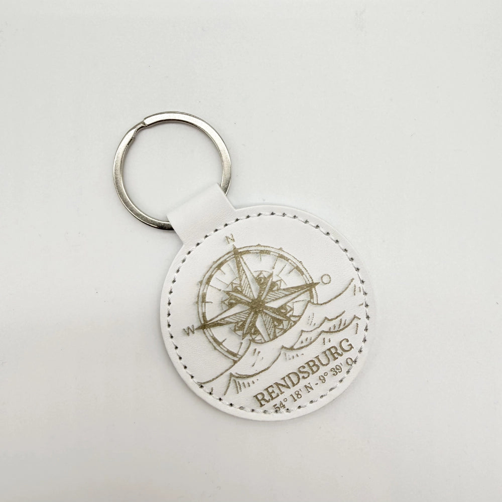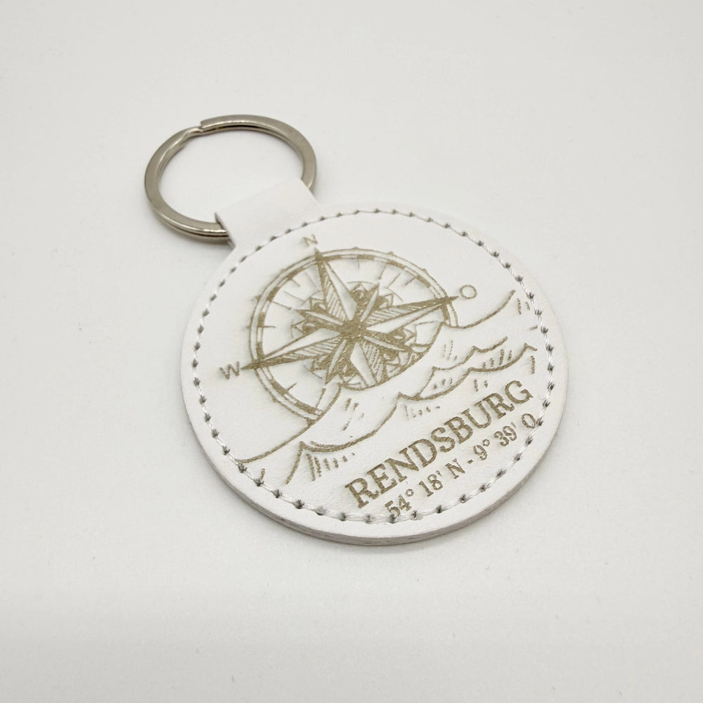 Schlüsselanhänger aus Kunstleder "Rendsburg Kompass" ist ein Statement für deine Verbundenheit zur Stadt Rendsburg. Mit kleinem Fach auf der Rückseite für z.B. Transponderchip oder Einkaufswagenchip. Jedes Stück ist ein Unikat und wird in unserer Werkstatt individuell für dich graviert.