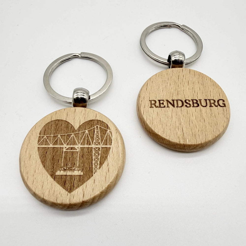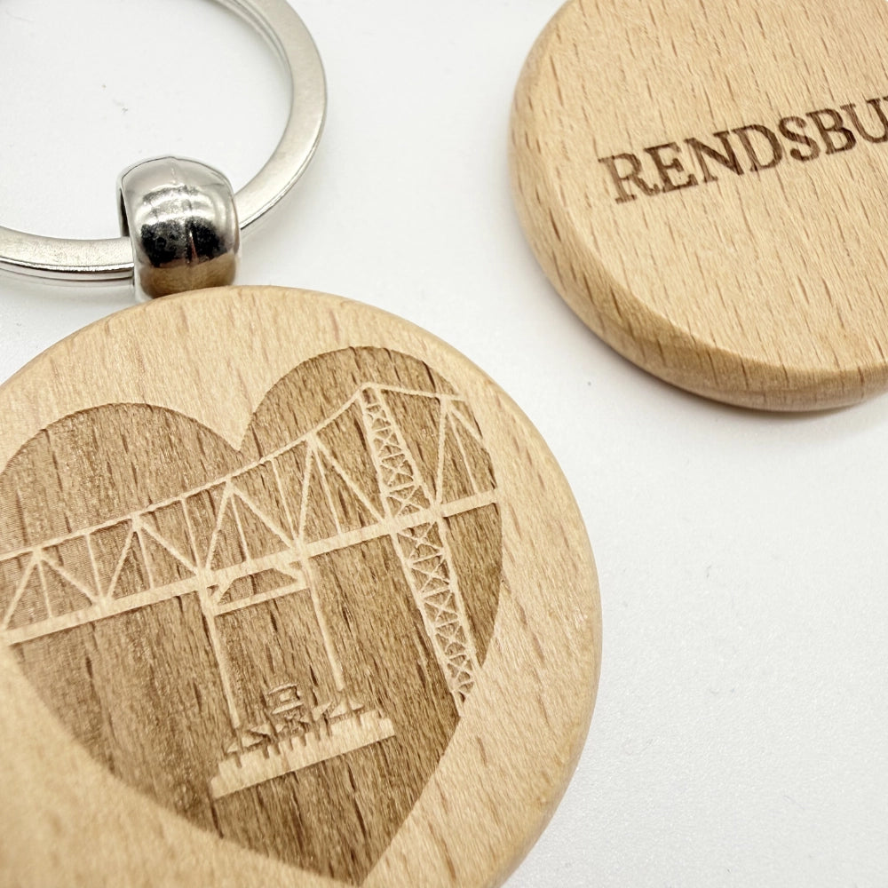 Dieser runde natürliche Schlüsselanhänger aus Holz mit Motiv der Rendsburger Schwebefähre ist das perfekte Stück Heimat für alle Rendsburger und Fans der Stadt.