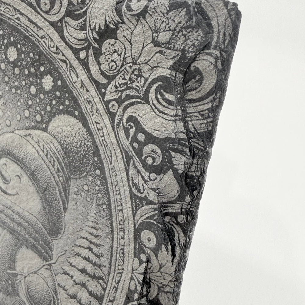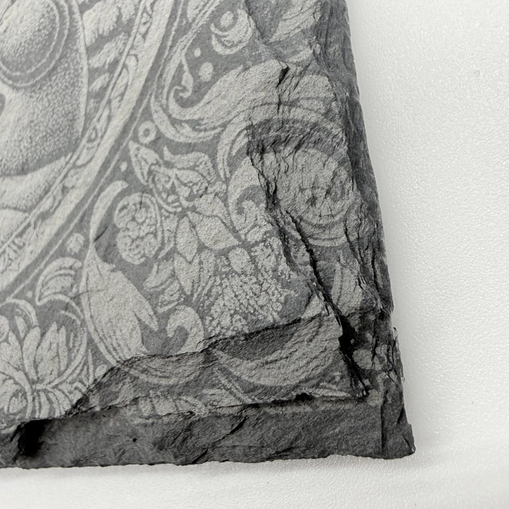 Dieser hochwertig gelaserte Schiefer-Untersetzer bringt winterliche Gemütlichkeit und stilvolle Eleganz auf deinen Tisch. Jeder Untersetzer ist ein Unikat und wird in unserer Werkstatt für dich graviert, wobei die natürliche Struktur des Schiefers erhalten bleibt.